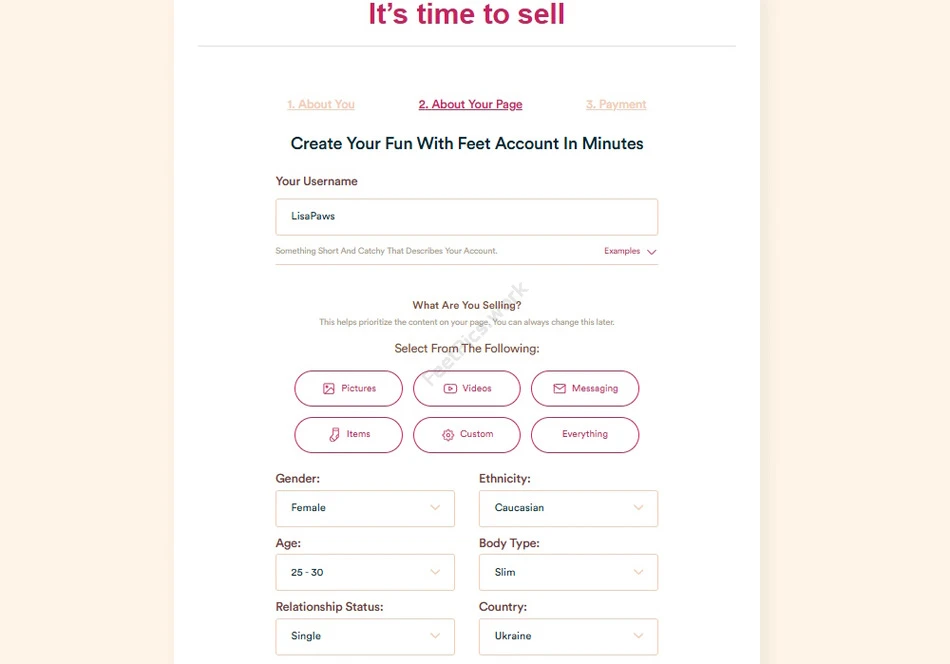 Придумайте короткий и запоминающийся ник - он будет отображаться в вашем профиле. Затем укажите, что именно вы планируете продавать (фото, видео, кастомный контент).