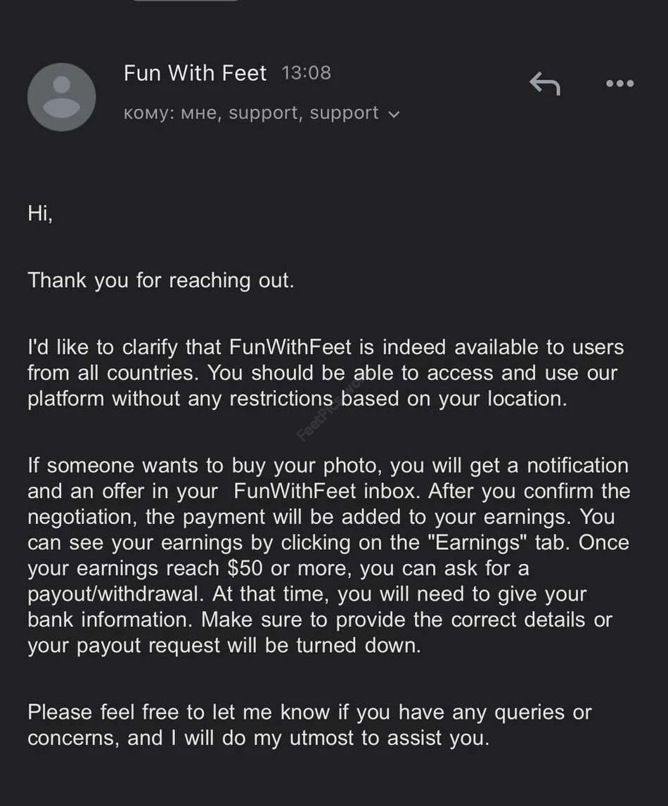 Я связалась с поддержкой и уточнила: продавать контент на Fun with Feet могут пользователи из любой страны, включая Россию, Украину и другие страны СНГ. Платформа не вводит гео ограничений, и вывод средств доступен всем пользователям без исключений, что выгодно отличает её от FitFinder, где есть ограничения по регионам.