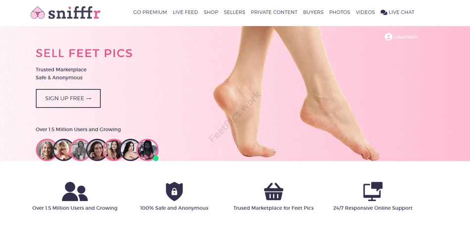 Snifffr создавался как фетиш-маркетплейс, но раздел “Feet” тоже активный. Именно тут проще всего начать продавать фото ног и получать первые заказы.