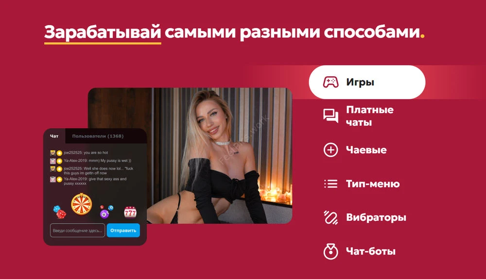 - Бесплатный чат (free chat) - вы в эфире для всех, а доход идёт в основном от чаевых и покупок из меню/темы/бота.